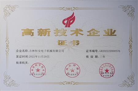 熱烈祝賀:吉林恒安電子機(jī)械有限公司在2022年吉林省科學(xué)技術(shù)廳高新技術(shù)企業(yè)評(píng)定工作中,榮獲高新技術(shù)企業(yè)證書(shū)。